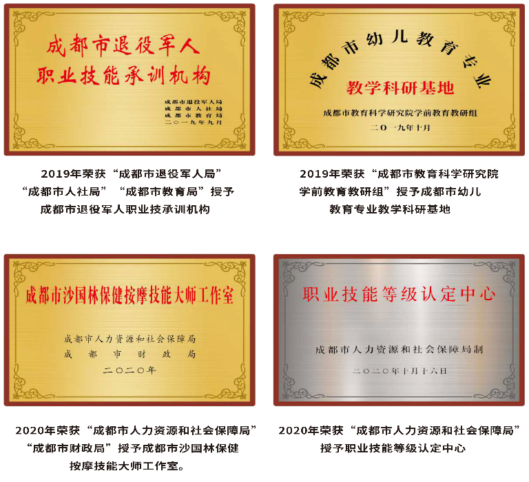 学校发展势头强劲,管理规范,人才培养质量过硬,取得了良好的成绩:2018年成功获批“成都市高技能人才培训基地”;2019年成功获批“成都市退役军人职业技能承训机构”;2020年获批“成都市沙国林保健按摩师技能大师工作室”、“成都市职业技能等级认定试点技工院校”;2021年获得“十三五”四川省技工教育技能人才培养“招生工作先进集体”、获得成都市第四届技工院校职业技能竞赛“优秀组织奖”、“2020-2021年度成都市人事考试优秀考点”,同年学校党支部被评为郫都区二星级“两新”党组织;2022年获得第五届“四川工匠杯”暨四川省第一届技工院校职业技能大赛“组织奖”、荣获2022年度郫都区“五四红旗团委”;2023年我校被授予“四川省技工教育表现优秀单位”、“成都市郫都区技能人才培养示范基地”、“成都市郫都区技能人才俱乐部”等31项荣誉称号。