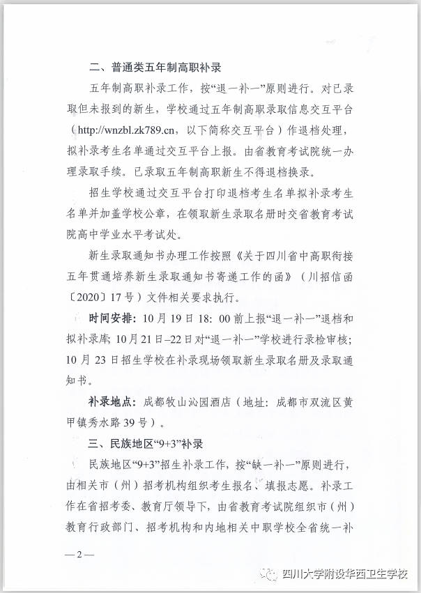 二、附:四川省教育考试院关于2020年五年制高职和民族地区“9+3”招生补录工作的通知