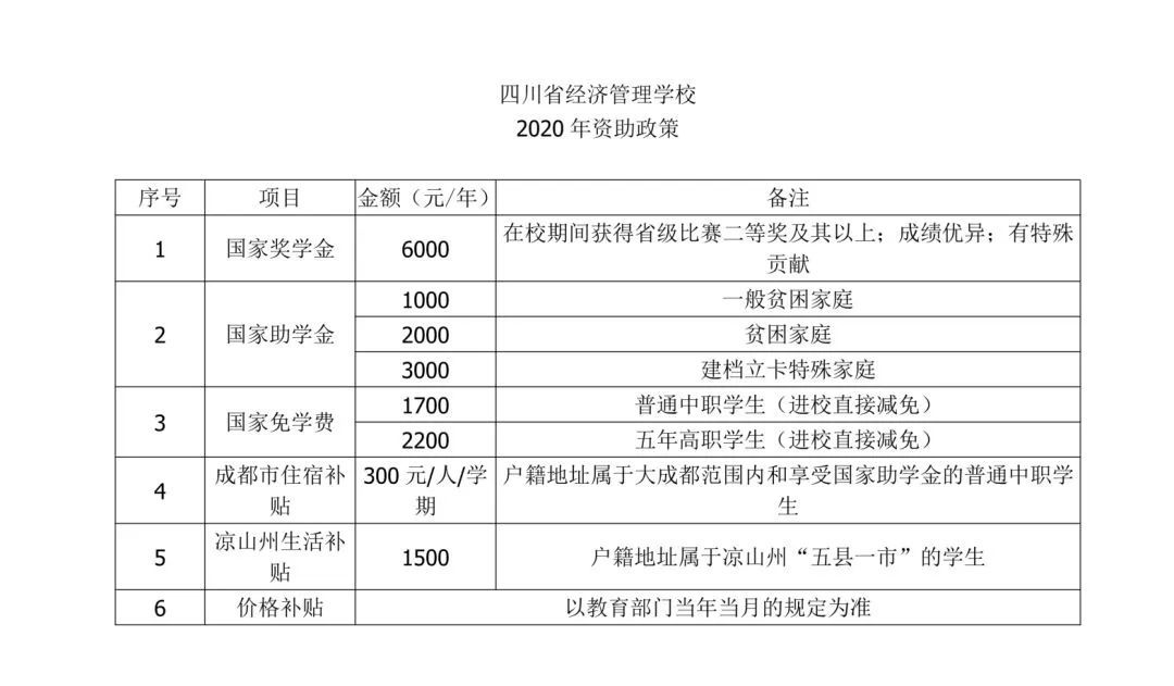 B、奖学金政策:学校将对品学兼优者评定国家助学金、学校奖学金、企业奖学金等。凡凉山州西昌市、德昌市、会理县、会东县、宁南县、冕宁县(5县一市)的学生可享受凉山州州外就读学生资助。