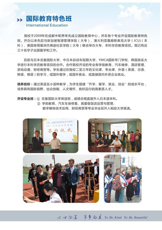 学校在成都市中职学校中率先开办国际教育,与新加坡智源管理学院、美国肯塔基州路易维尔友城杰弗逊社区学院、澳洲詹姆斯库克大学(新加坡校区)、日本吉备国际大学、中日本汽车学院等国际院校开展了多种形式的联合办学。还与一批国际国内知名企业、院校开展广泛合作,为学生发展构建就业?升学?留学?创业的成才立交桥。